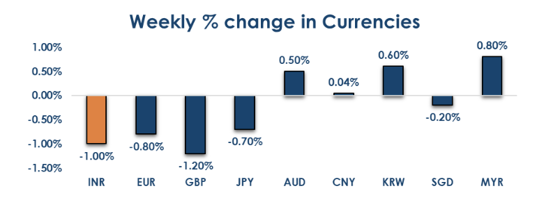 Rupee Weakness Resurfaces: The Indian Rupee turned out to be the worst-performing currency this week, with markets going long on the Dollar post-festive season. Despite positive signals around the India–US trade deal, a hawkish Fed weighed heavily on sentiment, pushing the Rupee back to the weakest-performing Asian currency YTD. The currency traded in the 87.87–88.77 range, closing at the week's low of 88.77.