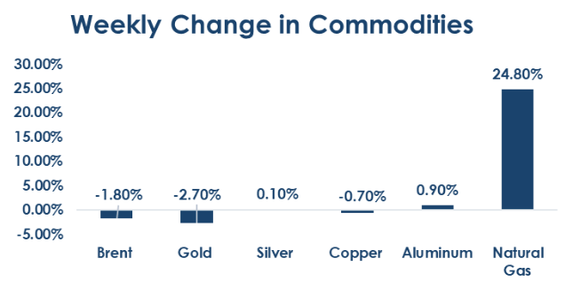 Energy: Brent crude slipped 1.8% to $64.8, while US Natural Gas surged 24.8% to $4.12, indicating strong heating and power demand.